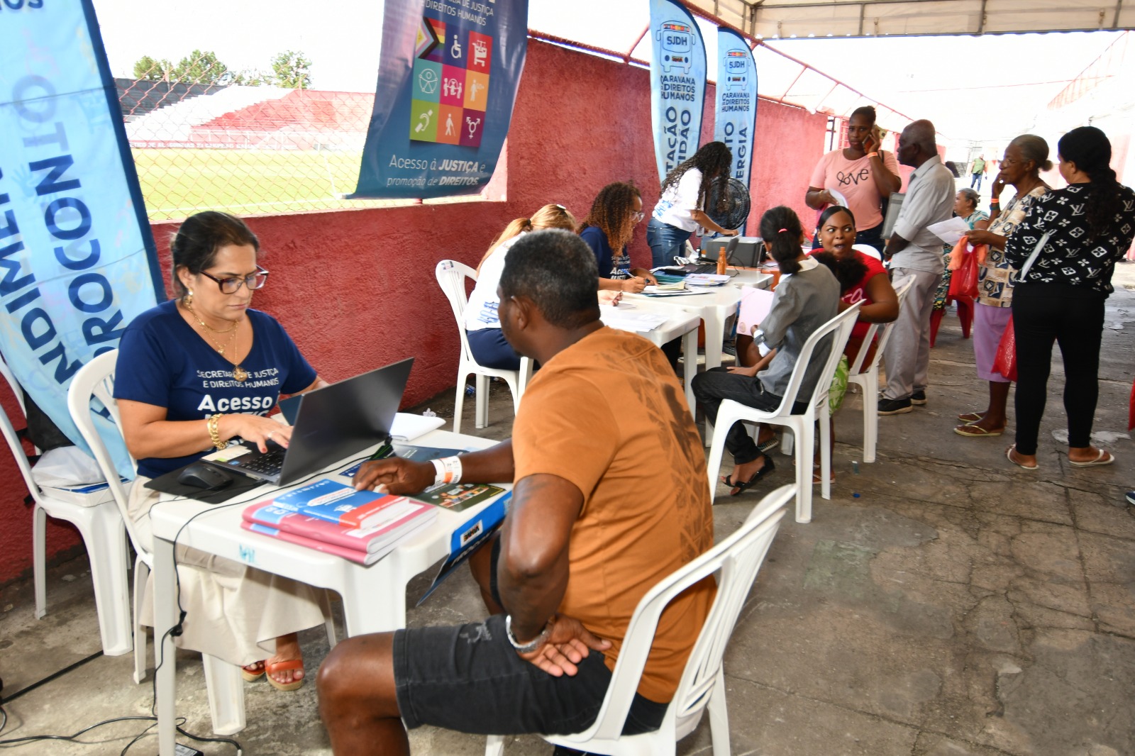 Desde ontem, 27 de abril, o Estádio Carneirão, em AlagoCaravana dos Direitos Humanos deve atender a 3.500 pessoas em Alagoinhasinhas, se tornou um verdadeiro ponto de serviços de cidadania e acolhimento ao cidadão. É a Caravana dos Direitos Humanos, que vai funcionar no local até amanhã, 29, com a expectativa de realizar 3.500 atendimentos, reunindo serviços essenciais em um só lugar e facilitando o acesso da população, especialmente a mais vulnerável, a direitos básicos. Nesta terça, 28, o projeto, realizado pela Secretaria de Justiça e Direitos Humanos do Estado da Bahia, recebeu as visitas do chefe de gabinete da Secretaria de Justiça e Direitos Humanos do Estado da Bahia, Raimundo José Pedreira do Nascimento, e da superintendente de Justiça da Bahia, Trícia Calmon, que foram recebidos pelo prefeito Gustavo Carmo e pela secretária de Desenvolvimento Social, Lianne Carmo, e por representantes de instituições parceiras.